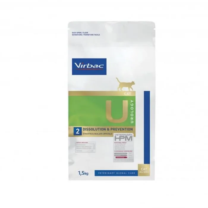 Hrana dietetica pentru pisici are proprietati de alcalinizare urinara pentru a reduce riscul de formare a calculilor de oxalat. In plus, hrana dietetica contine proprietati de subsaturare urinara in ceea ce priveste struvitul, precum si un continut scazut de calciu, magneziu si vitamina D. Virbac Veterinary HPM Cat Urology Dissolution & Prevention U2 este bogata in proteine animale si saraca in carbohidrati.